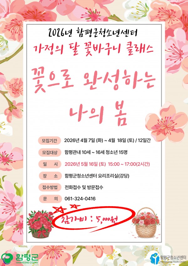 - [모집] 2026년 함평군청소년센터 똑똑! 솜씨학교 '꽃으로 완성하는 나의 봄' (생화 꽃꽂이) 참가자 모집!